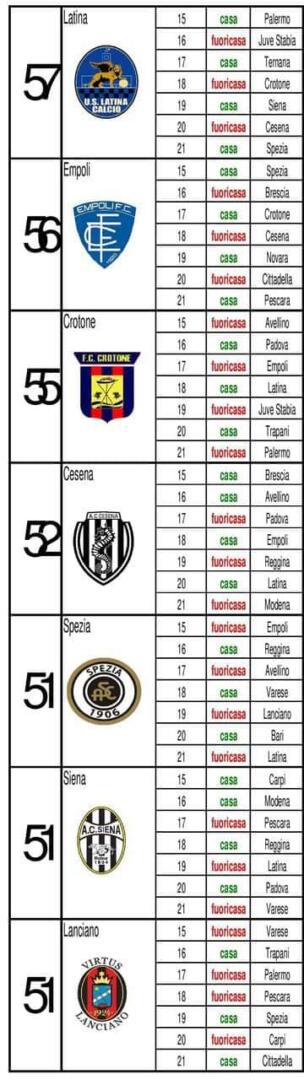 Secondo me la lotta per il secondo posto se la giocano soltanto Empoli, Cesena, Spezia e Siena. Escludo Crotone, Lanciano e Latina nonostante gli ottimi risultati ottenuti da queste ultime 3 squadre.