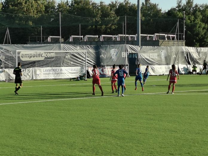 Le azzurre cominciano subito forte e al 9′ sono in vantaggio grande alla neoarrivata Elisa Polli che di piatto appoggia in rete un bell’assist di Prugna. Passano pochi minuti e Prugna raddoppia realizzando un rigore concesso per fallo su Di Guglielmo. L’Empoli dilaga e al 33′ sigla il 3-0 con la doppietta personale di Polli che in scivolata insacca su assist di Glionna. Al 37′ arriva il poker grazie alla tripletta di Polli che mette in rete da due passi dopo una traversa colpita dopo un gran tiro di Cinotti. Al 40′ arriva il bellissimo gol di Cinotti che sigla il 5-0 con un tiro dai 30 metri che si insacca sotto la traversa. Partita giร chiusa nel primo tempo.