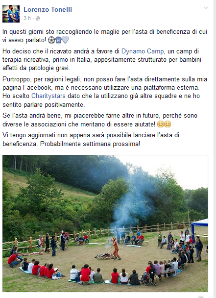 Come vi avevamo anticipato qualche giorno fa, il difensore azzurro Lorenzo Tonelli ha deciso di organizzare un’asta benefica di vendita di accessori (maglie, scarpini) da lui indossati per aiutare bambini bisognosi. E, attraverso il suo profilo Facebook, Lorenzo ha reso note le modalità (anche se ancora c’è qualche dettaglio da decidere) di vendita degli oggetti in questione: il ricavato dell’asta andrà a Dynamo Camp, un camp di terapia ricreativa, primo in Italia, appositamente strutturato per bambini affetti da patologie gravi. Visto che non è possibile svolgere una vera e propria asta sul popolare social network, il difensore ha deciso di appoggiarsi a CharityStars, già utilizzata in passato per la vendita di magliette dei calciatori di Serie A.