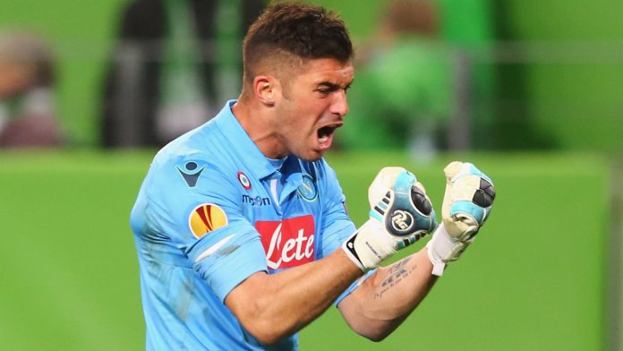 WOLFSBURG, GERMANY - APRIL 16: Mariano Andujar of Napoli celebrates as Marek Hamsík of Napoli scores their third goal during the UEFA Europa League Quarter Final first leg match between VfL Wolfsburg and SSC Napoli at Volkswagen Arena on April 16, 2015 in Wolfsburg, Germany. (Photo by Martin Rose/Bongarts/Getty Images)