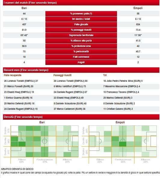 Ecco, con i dati rilevati da “Panini Digital” i numeri del match giocato ieri pomeriggio al “San Nicola” tra Empoli e Bari