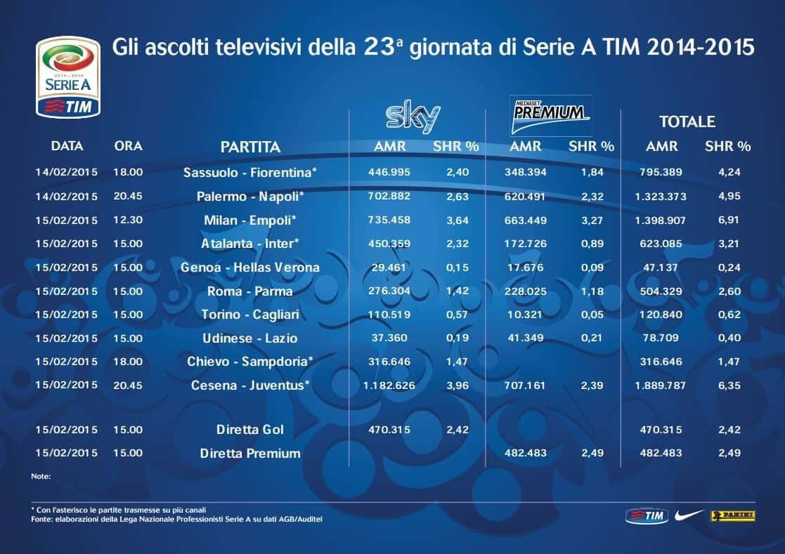 La Lega di serie A ha diramato i dati degli spettatori televisivi che hanno assistito alle gare del massimo campionato della 4a giornata. Emerge un dato davvero importante per quanto riguarda la gara di San Siro che ha visto in campo gli azzurri, infatti sommando i dati Sky con quelli Mediaset emerge un totale di , numero da vero capogiro.