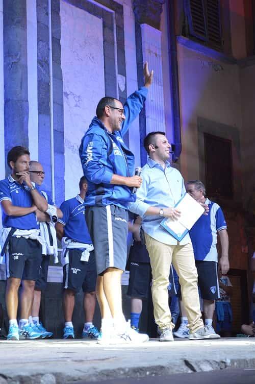 Al nome di Maurizio Sarri la piazza si è definitivamente fatta incandescente, segno dell’attaccamento che i tifosi nutrono per l’allenatore. Il mister ha così esordito: “Devo ancora una volta ringraziare questi tifosi stupendi, perché è soprattutto grazie a loro che abbiamo coronato il nostro sogno di giocare in Serie A. La forza che ci danno quotidiamente è grande e ci dà una grossa spinta, spetterà a noi ora ripagare la loro fiducia. Sappiamo bene che il 100% potrebbe non bastare quest’anno, per questo pretenderò sempre di più dai miei ragazzi, dovranno dare l’anima. Tutta l’Italia crede che siamo retrocessi in partenza, ma mi piacerebbe davvero sconfessarli tutti. Non ho ancora realizzato di essere in A, credo che lo farò nel momento in cui metterò piede nei più grossi stadi italiani”.