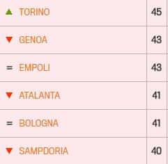 Ops. Avevo preso un lapsus, Non siamo a sfavore con il Genoa (abbiamo vinto 2-0 qua e perso 1-0 da loro)…mentre con il Torino abbiam vinto 1-0 la e per adesso siamo avanti nella classifica avulsa. Meglio. con 4 punti (di cui 3 con il Torino) avremmo più del 50% di arrivare decimi