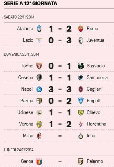 In attesa del derby di Milano di questa sera e del posticipo di lunedi, si è giocata nel pomeriggio di oggi la maggior parte dei confrinti del massimo campionato, vediamo i risultati.