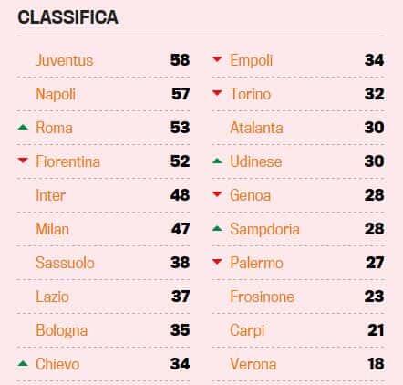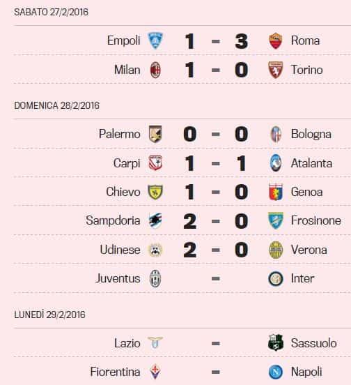 Mancano ancora tre gare all’appello, due delle quali verranno giocate addirittura domani. Nel pomeriggio di oggi pero’ si sono giocati la maggior parte degli incontri valevoli per la 27a giornata della serie A 2015/16.