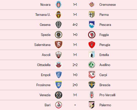 Vince il Frosinone ma frena il Cittadella, risultati che permettono agli azzurri di essere momentaneamente al terzo posto. Pari dell’Ascoli con l’Entella alla prima di Cosmi che giocava contro l’ultimo ex bianconero, Aglietti. Questi i risultati finali: