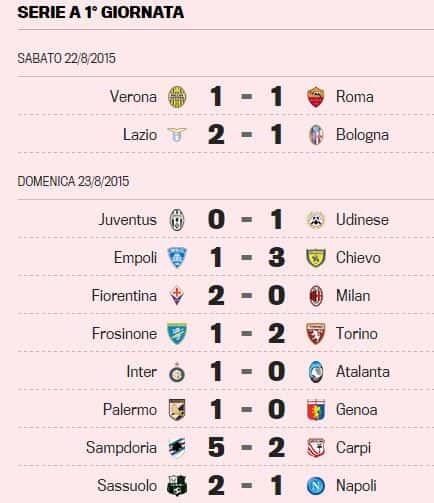 Home Empoli Risultati finali 1a giornata serie A Tim Risultati finali 1a giornata serie A Tim Di Alessio Cocchi - 23 Agosto 2015 0 Questi i risultati finali emersi dopo il primo turno del campionato 2015/16. Non sono mancate le sorprese come spesso capita alla prima. ARTICOLI CORRELATIALTRO DALL'AUTORE Empoli Presentata la prima collezione di figurine Panini Calciatori Serie BKT Empoli Info biglietti per Empoli-Frosinone Empoli La storia di Mantova-Empoli LASCIA UN COMMENTO Cancella la risposta Please enter your comment! Please enter your name here You have entered an incorrect email address! Please enter your email address here Save my name, email, and website in this browser for the next time I comment. Δ Le ultime fotogallery Empoli Galleria Serie B 2025/26 | Empoli – Palermo Massimiliano Ciabattini - 7 Dicembre 2025 0 Galleria Serie B 2025/26 | Empoli – Bari 29 Novembre 2025 Galleria Serie B 2025/26 | Avellino – Empoli 23 Novembre 2025 Galleria Serie B 2025/26 | Empoli – Catanzaro 8 Novembre 2025 Galleria Serie B 2025/26 | Virtus Entella – Empoli 1 Novembre 2025