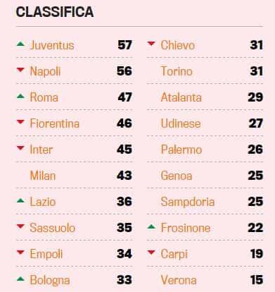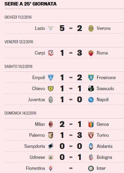 Manca ancora il posticipo di questa sera tra Fiorentina ed Inter ma di fatto si è chiuso il 25° turno di campionato spalmato addirittura su quattro giorni. Il campionato ha adesso una nuova capolista, la Juventus. Azzurri che perdono due posti e sono adesso noni.