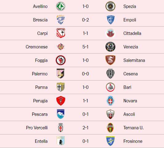 Infatti ci sono le matematiche retrocessioni in C di Ternana e Pro Vercelli, ma si sono definite anche le squadre che parteciperanno al playoff visto che il Foggia (nono) non può più agganciare il Perugia (ottavo). In testa vincono Frosinone e Parma mentre il Palermo non va oltre il pareggio a Cesena: Il Frosinone però vincendo potrà festeggiare la promozione. In coda discorso aperto con ad oggi messa male l’Entella che però vivrà uno spareggio anticipato settimana prossima contro il Novara.
