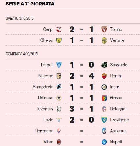 Home Empoli Risultati finali 7a giornata serie A Risultati finali 7a giornata serie A Di Alessio Cocchi - 4 Ottobre 2015 2 In attesa dei due posticipi delle 20:45, che chiuderanno il turno, si è giocata tra ieri ed oggi la 7a giornata del massimo campionato di calcio. Questi i risultati: ARTICOLI CORRELATIALTRO DALL'AUTORE Empoli Joseph Ceesay: “Siamo in fiducia. Quella di domenica sarà una bella sfida” Empoli News dal campo Empoli Serie B, termina in parità Juve Stabia-Bari 2 Commenti Fa rabbia vedere Guarin mandare axxanculo l arbitro impunemente mentre ad altri danno 3 giornate Risposta Potreste allegare anche la classifica? Risposta LASCIA UN COMMENTO Cancella la risposta Please enter your comment! Please enter your name here You have entered an incorrect email address! Please enter your email address here Save my name, email, and website in this browser for the next time I comment. Δ Le ultime fotogallery Empoli Galleria Serie B 2025/26 | Empoli – Bari Massimiliano Ciabattini - 29 Novembre 2025 2 Galleria Serie B 2025/26 | Avellino – Empoli 23 Novembre 2025 Galleria Serie B 2025/26 | Empoli – Catanzaro 8 Novembre 2025 Galleria Serie B 2025/26 | Virtus Entella – Empoli 1 Novembre 2025 Galleria Serie B 2025/26 | Empoli – Sampdoria 28 Ottobre 2025