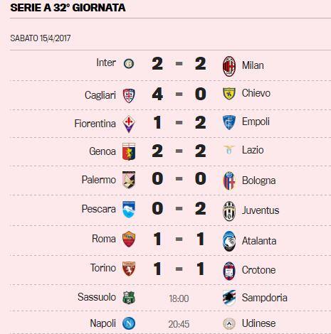 All’appello mancano ancora due gare ma di fatto si è giocato nel pomeriggio di questo sabato prepasquale il grosso del 32° turno del massimo campionato di calcio.