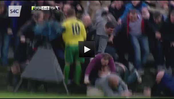 Quando si dice: “segna un gol spettacolare e viene giù la curva”. E’ successo davvero in Galles, dopo il gol che Darren Thomas ha segnato per il Muriau Caernarfon.