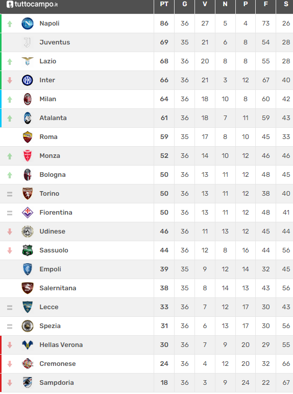Si è giocata la 36a giornata del campionato di Serie A. Il Napoli continua nei festeggiamenti dello scudetto e batte anche l’Inter 3-1. Per la squadra di Inzaghi molto turnover avendo da giocare mercoledì la finale di Coppa Italia con la Fiorentina. Ancora incerta e combattuta sia la lotta Champions che quella per la salvezza. La Lazio vince a Udine e si riporta al terzo posto mentre si rifà sotto il Milan che travolge di reti la Sampdoria portandosi a due punti di ritardo dall’Inter attualmente al quarto posto. Oggi giornata decisiva in casa Juventus sulla più che probabile nuova penalizzazione per il filone dell’inchiesta sulle plusvalenze. Le voci che si rincorrono parlano di circa 8/10 punti in meno, in serata è attesa la sentenza. Per quanto riguarda la lotta salvezza finisce in parità lo scontro diretto tra Lecce e Spezia mentre il Verona rimane al terz’ultimo posto dopo la sconfitta di Bergamo con l’Atalanta. Sarà una lotta fino all’ultima giornata anche se la prossima, la penultima, rischia di essere già quella decisiva. Intanto è arrivata la retrocessione matematica della Cremonese, sconfitta in casa 5-1 dal Bologna.