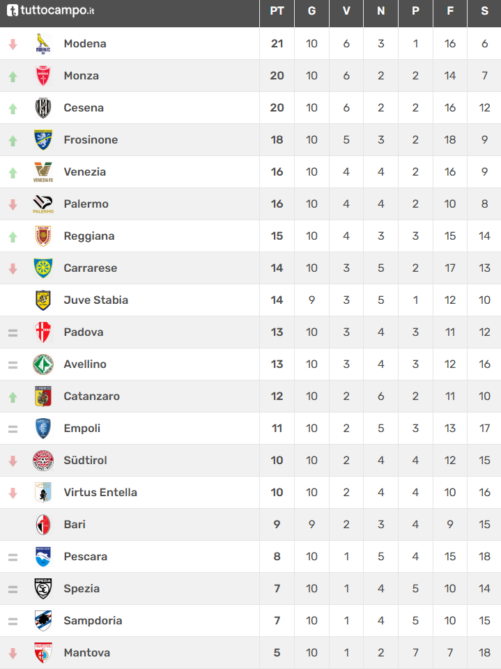 Si è giocato il turno infrasettimanale valevole per la 10a giornata di B che ha visto la grande vittoria del Monza a Palermo con un netto 3-0. Per la squadra di Bianco è la quarta vittoria consecutiva. A sorpresa cade il Modena nel derby con la Reggiana mentre continua a vincere il Cesena che batte la Carrarese 2-1 e rimane nelle zone alte di classifica. In parità la sfida del Castellani tra Empoli e Sampdoria. Nelle gare di oggi vittoria senza problemi del Venezia con il Sudtirol mentre il Catanzaro rimonta lo svantaggio inziale a Mantova e conquista la seconda vittoria consecutiva.