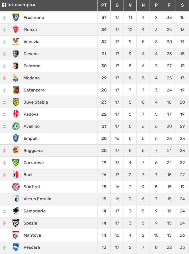 In attesa delle ultime due gare di oggi, la 17a giornata di Serie B si è aperta venerdì con la vittoria esterna del Catanzaro a Bari con la squadra di Aquilani in piena zona playoff mentre è in crisi la squadra di Vivarini. Nelle gare di ieri ancora una vittoria della capolista Frosinone contro lo Spezia mentre il Monza riscatta gli ultimi deludenti risultati e travolge la Carrarese. Colpaccio anche del Venezia che sbanca Modena mentre il Palermo il Cesena vengono entrambe fermate dal pareggio rispettivamente contro Avellino e Juve Stabia. Il Pescara coglie tre punti vitali che lo mantengono ancora in corsa per la salvezza. Oggi gli ultimi due posticipi che chiuderanno questa giornata. Si tornerà in campo venerdì 26 dicembre con il primo anticipo della 18a giornata mentre tutte le altre gare si giocheranno sabato 27/12.