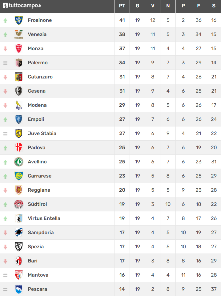 Dopo la sosta invernale, è ripreso il campionato di Serie B con le gare della 19a giornata, ultima del girone di andata. Il Frosinone si conferma la capolista solitaria battendo con un netto 2-0 il Catanzaro mentre viene sconfitto a sorpresa il Monza che cade a Chiavari con l’Entella. Ne approfitta il Venezia che vince a Reggio Emilia e si porta al secondo posto in classifica. Grande vittoria anche dell’Empoli che espugna Cesena grazie a una rete di Ilie e torna in zona playoff. Nella corsa alla salvezza fondamentale vittoria del Sudtirol che batte lo Spezia e della Carrarese sul Bari sempre più in crisi. Si ferma la Sampdoria che viene sconfitta a Avellino. Nelle gare giocate oggi grandi sorprese con il Palermo che va subito in vantaggio a Mantova per poi subire al 95′ il pari dei padroni di casa mentre il Padova batte 2-0 il Modena e si porta a ridosso della zona playoff.