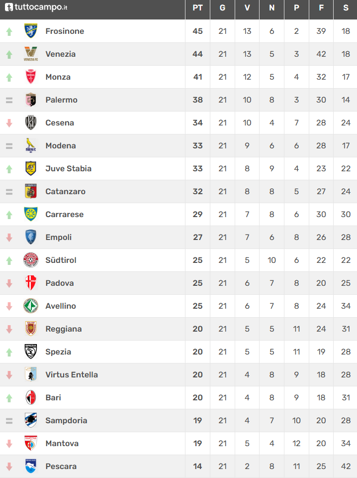 Si è giocata la 21a giornata di Serie B che si è aperta con la grande vittoria della Carrarese nel derby con l’Empoli. Un Empoli quasi mai in partita che ha deluso sotto tutti i punti di vista. Nelle gare di ieri prosegue la marcia del Frosinone che batte di misura la Reggiana e mantiene il primo posto in solitaria con un punto di vantaggio sul Venezia che ha sommerso di gol il Mantova per 5-2. Venezia che è giunto alla sesta vittoria consecutiva. Tiene il passo anche il Monza al terzo posto battendo con un netto 3-0 il Pescara con la doppietta del neo arrivato Hernani. Vittoria importantissima della Juve Stabia in ottica play off mentre il Bari con il nuovo allenatore Longo compie l’impresa a Cesena. Finisce senza reti tra Modena e Palermo mentre lo Spezia ottiene tre punti fondamentali nella lotta alla salvezza contro l’Avellino. Oggi larga vittoria del Suditorol che rifila tre reti al Padova mentre finisce in parità la sfida tra Catanzaro e Sampdoria.