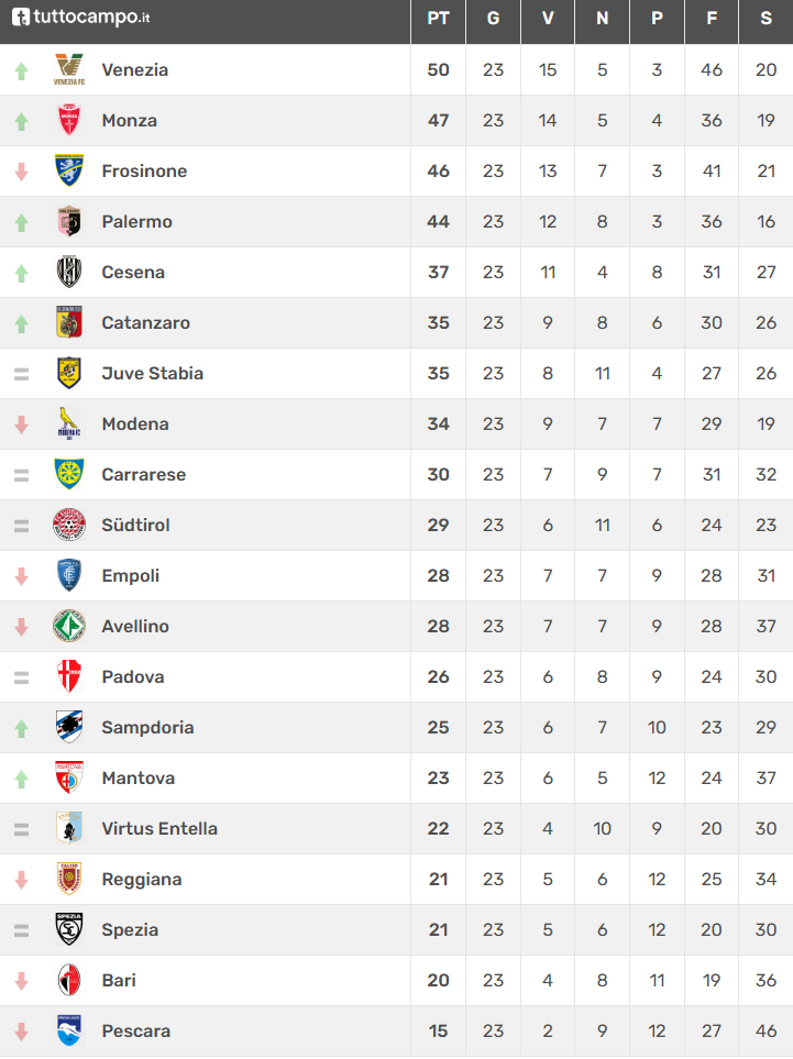 Si è giocata la 23a giornata di Serie B che si è aperta venerdì con il successo del Cesena sul Pescara per 2-0. I romagnoli consolidano la loro posizione in zona playoff mentre il Pescara si avvicina sempre più alla retrocessione. Nelle gare di ieri grandissima prova di forza del Venezia che vince lo scontro diretto a Frosinone e allunga in classifica al primo posto in solitaria. Per i lagunari è l’ottava vittoria consecutiva. Importantissimo successo del Mantova sul Bari e della Sampdoria che torna alla vittoria in trasferta dopo 3 mesi espugnando Modena. Pari spettacolo tra Juve Stabia e Padova mentre il Palermo nel finale riesce a conquistare i tre punti contro un’ottimo Empoli. Pari nel derby ligure tra Spezia e Entella mentre nel posticipo di oggi il Monza vince in rimonta con l’Avellino. Passano in vantaggio gli irpini con Biasci poi la rimonta dei padroni di casa con Cutrone e Pessina. Con questa vittoria il Monza si porta da solo al secondo posto in classifica con un punto sul Frosinone e tre sul Palermo.