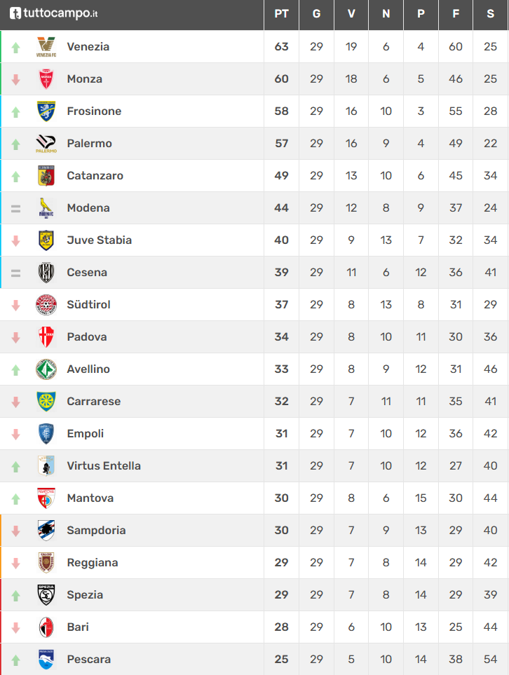 Si è giocata la 29a giornata del campionato di Serie B che ha visto la capolista Venezia rimanere da sola al comando della classifica grazie alla vittoria sulla Reggiana e alla contemporanea sconfitta del Monza a Spezia; la squadra di Bianco si porta in vantaggio 2-0 dopo venti minuti, poi rimane in dieci uomini per l’espulsione di Carboni e subisce la clamorosa rimonta dello Spezia che vince 4-2. Vittorie importantissime nella corsa salvezza per l’Entella che sbanca Bolzano battendo di misura il Sudtirol, dell’Avellino che in pieno recupero batte il Padova e del Mantova che rifila un 2-0 alla Juve Stabia. Netta vittoria del Frosinone sulla Samp che si riavvicina alla seconda posizione seguita a ruota dal Palermo che espugna di misura il campo di Carrara. Clamorosa la sconfitta dell’Empoli che si porta in vantaggio 2-0 a Catanzaro a fine primo tempo per poi subire la rimonta dei padroni di casa che vincono 3-2. Empoli sempre più in crisi di risultati visto che la vittoria non arriva da dieci partite. Nel posticipo larga vittoria del Pescara sul Bari che torna a sperare nella salvezza.