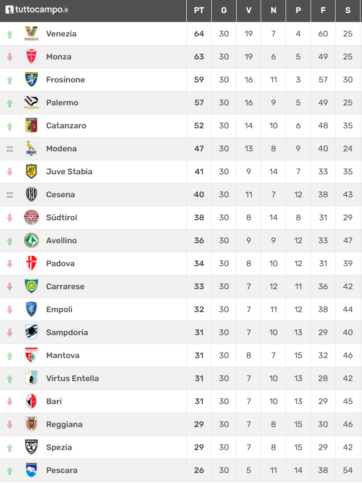 Si è giocata la 30a giornata di Serie B che ha visto la capolista Venezia frenata sul pari dalla Samp guidata dal nuovo allenatore Lombardo. I lagunari comandano ancora da soli la classifica con un punto di vantaggio sul Monza che hanno nettamente dominato il Palermo sconfiggendolo 3-0. Pareggia il Frosinone a Cesena con i romagnoli che esonerano il proprio allenatore Mignani. Al Castellani finisce in parità 2-2 tra Empoli e Mantova. La squadra di Modesto si porta in vantaggio 2-0 a fine primo tempo poi nella ripresa la rimonta degli azzurri di Caserta. Nella lotta salvezza successi fondamentali del Bari sulla Reggiana e dell’Avellino che espugna Chiavari. In parità la sfida tra il Sudtirol e il Pescara. Martedì di nuovo in campo con gli anticipi della 31a giornata.