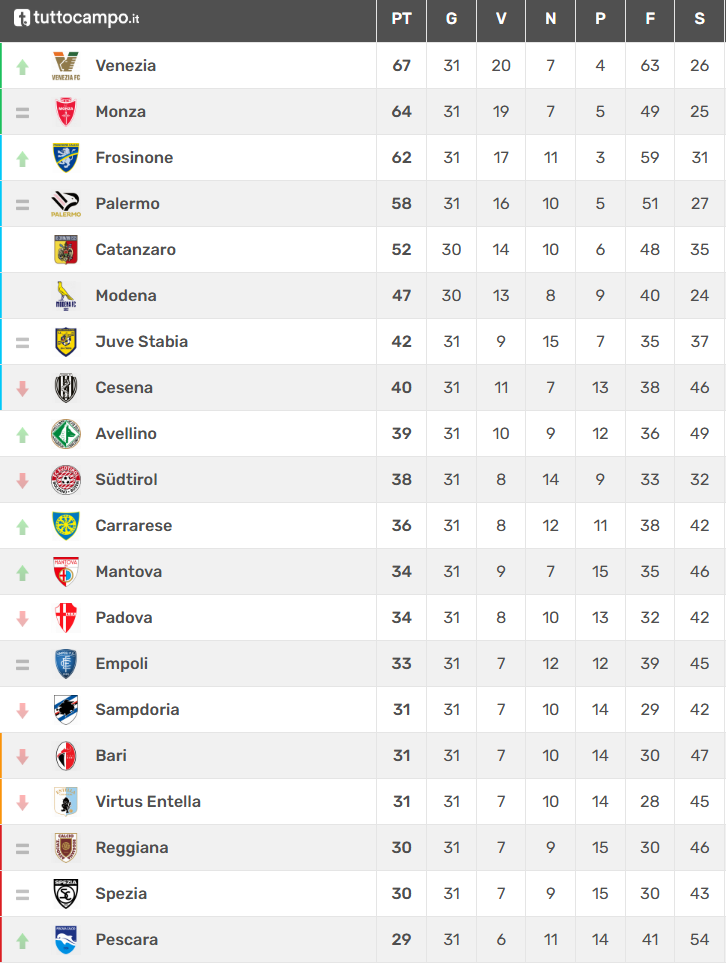 Si è giocato il turno infrasettimanale valevole per la 31a giornata di B che ha visto la capolista Venezia avere la meglio nel derby con il Padova mentre il Monza è stato fermato sul pari a Reggio Emilia dalla Reggiana. I lagunari comandano con tre punti di vantaggio proprio sul Monza. Al terzo posto si riavvicina il Frosinone che rimonta lo svantaggio iniziale con il Bari portandosi a due punti dal Monza mentre il Palermo viene frenato dal pari con la Juve Stabia e si allontana dalla corsa alla promozione diretta. Per la lotta salvezza grande vittoria per 3-0 del Mantova sul Cesena del neo allenatore Cole e del Pescara che travolge 3-0 l’Entella trascinato ancora una volta da un grande Insigne, con gol e due assist. Torna alla vittoria anche la Carrarese che batte 2-0 la Samp. Rinviata a data da destinare per allerta meteo Catanzaro-Modena.