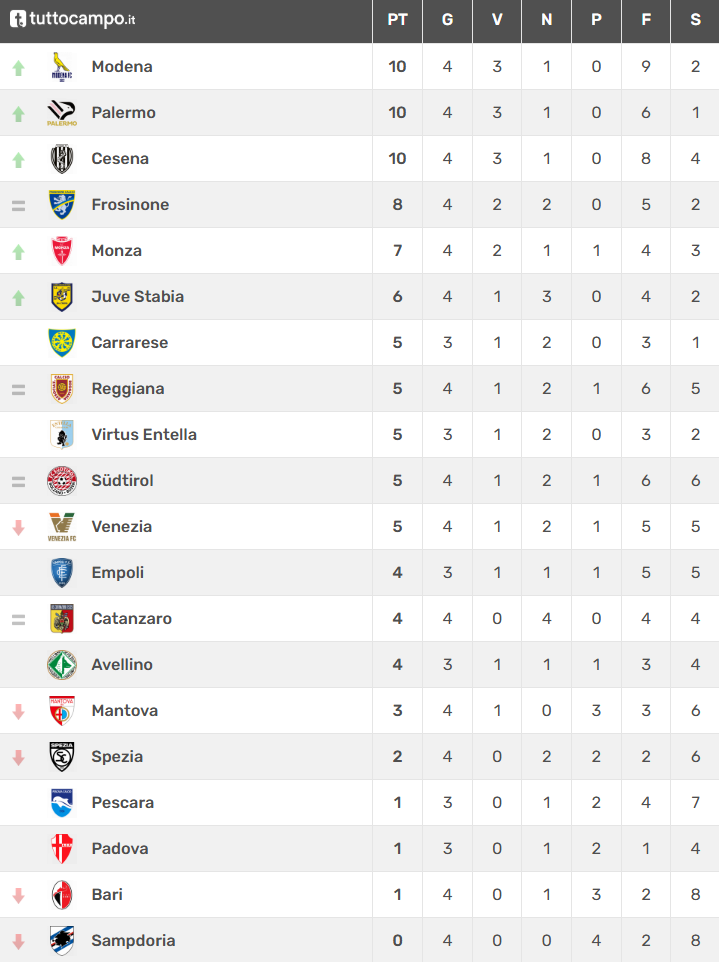 In attesa delle gare di oggi vediamo i risultati della quarta giornata di Serie B che si è aperta venerdi’ con due anticipi; Il Frosinone si porta sul 2-0 con il Sudtirol poi nella ripresa subisce la rimonta della squadra allenata da Castori mentre il Palermo si conferma la grande di questo campionato e batte anche il Bari con un netto 2-0. Grandi sorprese arrivano dalle vittorie esterne del Cesena e della Juve Stabia che battono rispettivamente Venezia e Spezia. Pari ricco di gol tra Reggiana e Catanzaro mentre il Monza batte la Samp lasciando i liguri all’ultimo posto in classifica con zero punti. Altra vittoria esterna del Modena che raggiunge in testa alla classifica Palermo e Cesena. Oggi le ultime partite in programma.