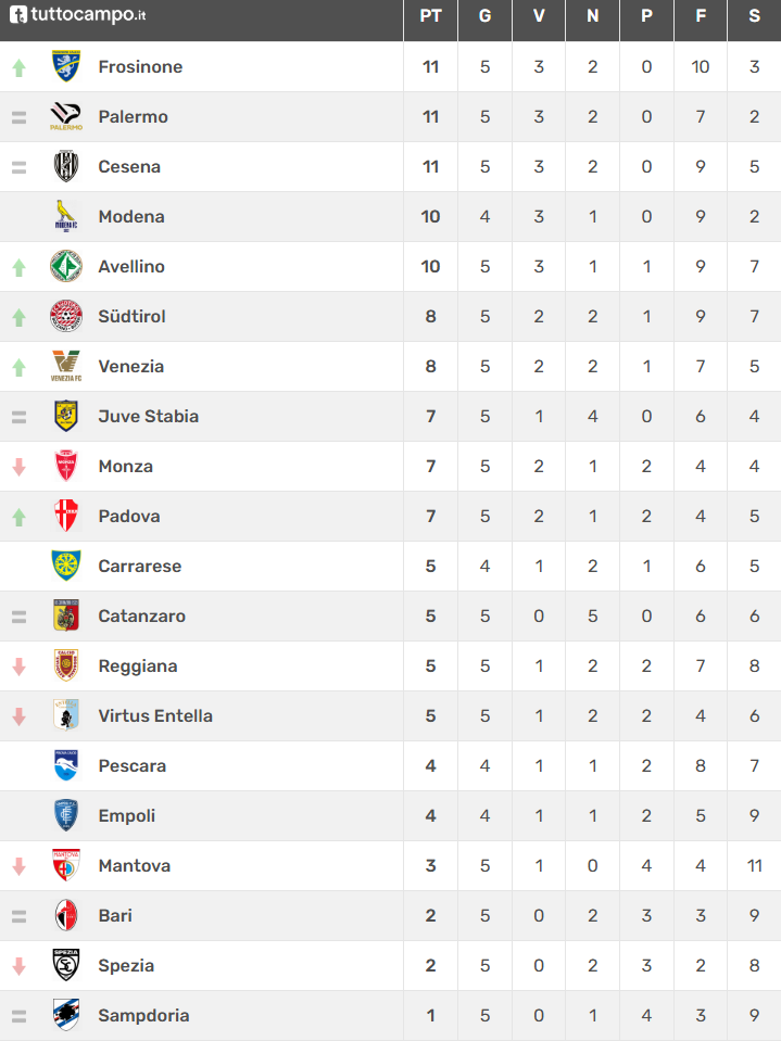 In attesa delle ultime due gare di oggi, vediamo i risultati delle altre partite giocate della quinta giornata che si è aperta venerdì con il pareggio tra Catanzaro e Juve Stabia con la squadra di casa che va sotto di due gol nel primo tempo e poi rimonta anche per le due espulsioni subite dalla Juve Stabia che ha chiuso la gara in nove uomini. Il Venezia torna alla vittoria battendo con un netto 2-0 lo Spezia mentre termina in parità il big match tra Cesena e Palermo. Manita del Frosinone a Mantova mentre il Padova fa il colpaccio a Monza con l’allenatore Bianco a forte rischio esonero. Primo punto della Samp che pareggia a Bari. Oggi il derby toscano Empoli-Carrarese e Modena-Pescara.