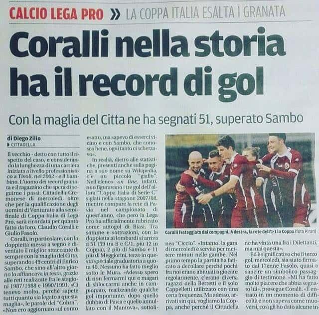 Facciamo i complimenti ad un ragazzo cresciuto nella cantera dell’Empoli: parliamo di Claudio “Cobra” Coralli, 34 reti in 91 presenze con la maglia azzurra (tutti i gol segnati in Serie B tra le stagioni 2008/09 e 2012/13, ndr). Con la maglia dell’Empoli, con cui ha segnato altre reti in Coppa Italia, esordì in Serie A nel 2007, prima di passare al Cittadella che trascinò in Serie B a suon di gol pesantissimi. Dopo una breve parentesi sfortunata alla Cremonese è tornato al Cittadella dove è ormai una bandiera del club veneto. Per lui altri gol pesanti ed importanti, punto di riferimento per i giovani del club che sta primeggiando nel Girone A della Serie C e che punta forte all’immediato ritorno in Serie cadetta. Ora Coralli è uomo-simbolo del Cittadella anche con la conferma dei numeri.