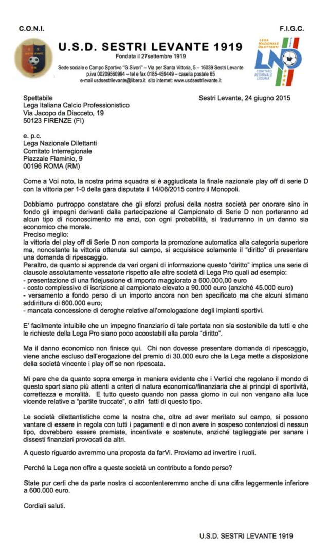 Sarà un’estate caldissima. Dopo il fallimento del Parma, si va verso altri incredibili fallimenti di altre nobili società: il Monza per esempio, ma anche la Reggina, nonostante si sia salvata ai Play Out contro il Messina (a proposito anche i siciliani sono coinvolti nel calcioscommesse, ndr) forse non riuscirà a risanare le casse ed iscriversi alla prossima Serie C. Così, sommata ai casi di illecito o presunto illecito relativi a Catania e Teramo (tanto per fare alcuni esempi, ndr), ma in Serie C sono davvero tantissime le squadre coinvolte, c’è chi dalla Serie D reclama, giustamente aggiungiamo noi, di essere ammessi alla categoria superiore, insomma nei professionisti. Una di queste società è il Sestri Levante, che con pieno merito ha vinto sul campo i Play Off di Serie D, ed avrebbe diritto al ripescaggio nei prof. I liguri a proposito di questo hanno pubblicato una lettera aperta che volentieri divulghiamo anche attraverso la nostra testata.