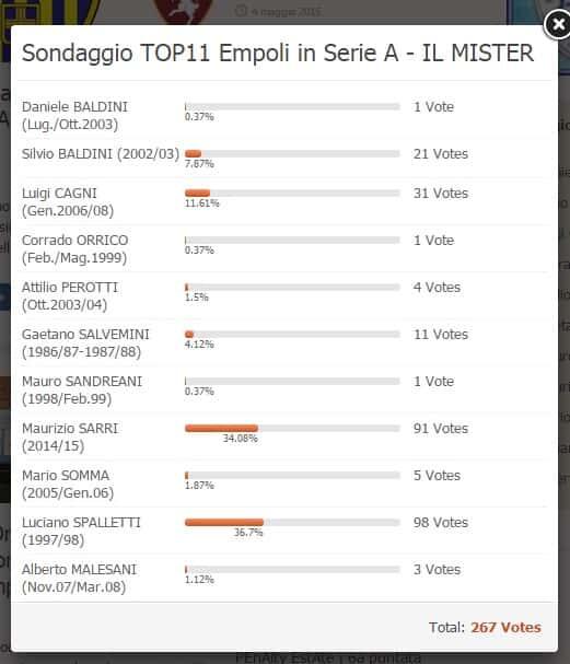 Tornando al sondaggio: vince Luciano Spalletti con cui in pratica tutto ha avuto inizio, per lui ha votato il 36,7%, mentre Maurizio Sarri si piazza secondo con il 34,08%. Sul podio, nettamente staccato però, colui che con l’Empoli ha conquistato la storica e per ora unica qualificazione in Europa League (o Coppa UEFA, chiamatela come volete, ndr) Gigi Cagni con l’11,61%. Quarto Silvio Baldini con il 7,87%. A seguire tutti gli altri: Gaetano Salvemini (4,12%), Mario Somma (1,87%), Attilio Perotti (1,5%), Alberto Malesani (1,12%), Daniele Baldini, Corrado Orrico e Mauro Sandreani tutti con lo 0,37%.