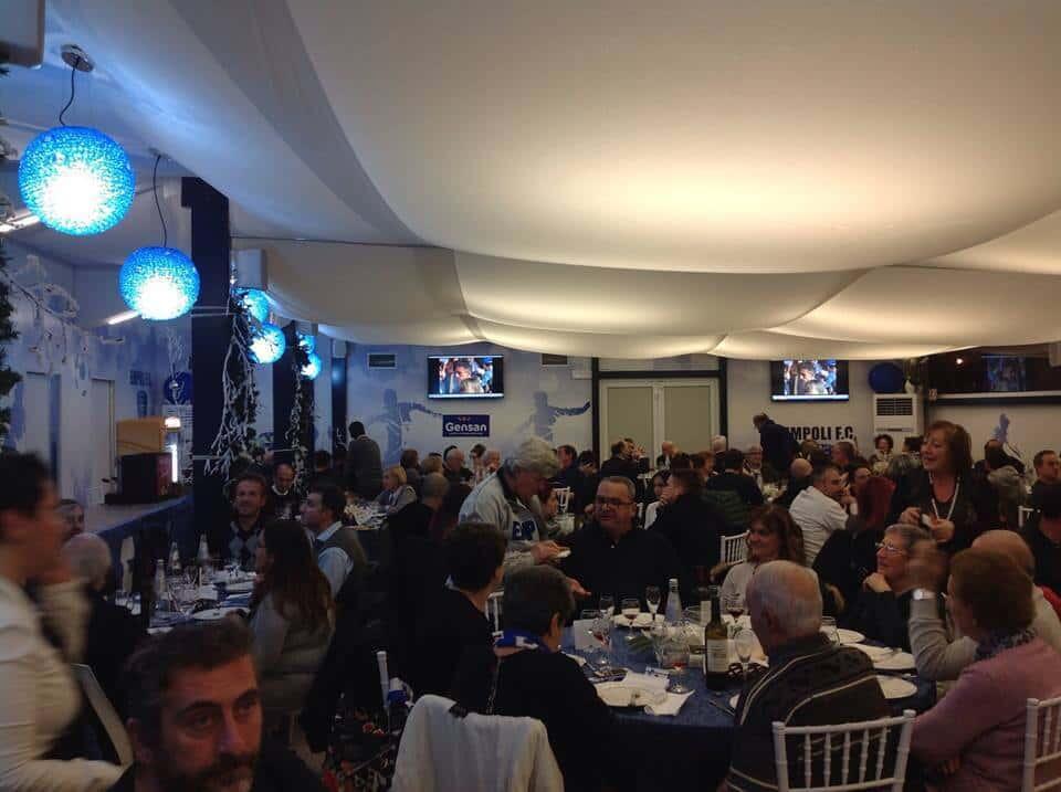 Tutto esaurito per la Cena di Natale 2015 organizzata dal Centro Coordinamento e andata in scena per la prima volta al “Ristorante VIP-AREA Empoli FC” allo Stadio Carlo Castellani. Clima di festa, cori, foto e autografi per mister Giampaolo, a cui i tifosi azzurri hanno donato un simpatico regalo riproducente un sigaro in vetro con relativo posacenere sempre in vetro, che ricordiamo è parte integrante della storia e della cultura di Empoli. Cori e applausi anche per i due portieri azzurri Pelagotti e Skorupski che promette “vogliamo portare sotto l’Albero di Natale altri tre punti”. Al portiere azzurro gli fa eco il mister: “vorremmo chiudere bene il 2015, per questo vogliamo fare bene anche a Bologna”.