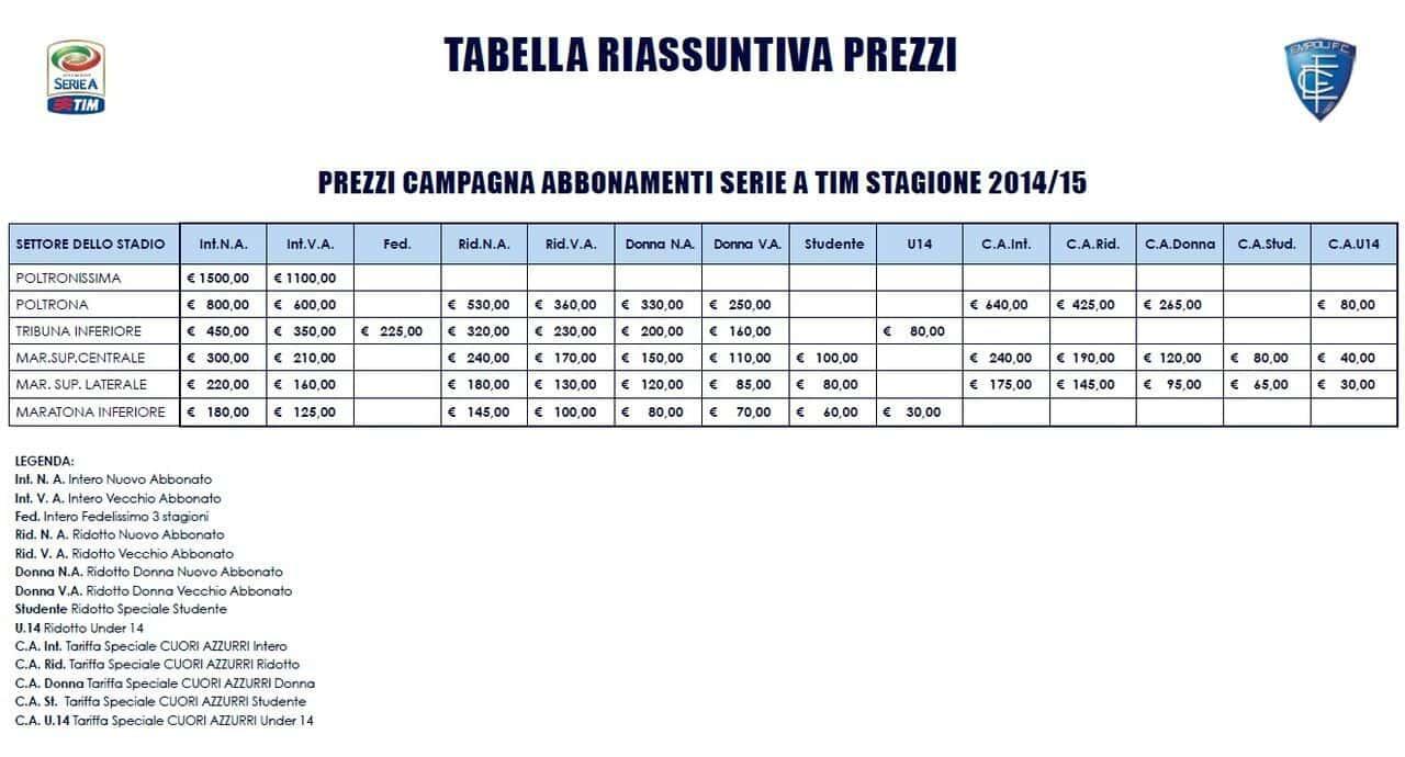 Per sottoscrivere l’abbonamento alla Stagione Calcistica 2014/2015, così come previsto dalla Direttiva del Ministro dell’Interno del 14 Agosto 2009 e ribadito con Determinazione n.26/2012 dall’Osservatorio sulle Manifestazioni Sportive, è necessario presentare un documento valido d’identità ed essere titolare della Fidelity Card BeEmpoli rilasciata dall’Empoli Fc; al fine di velocizzare l’emissione dell’abbonamento si consiglia di presentare anche il tagliando promemoria dello scorso anno. Il tagliando promemoria con l’indicazione del Settore, della fila e del posto acquistato verrà consegnato al momento della sottoscrizione dell’abbonamento; una parte di esso dovrà essere firmata dall’Abbonato per presa visione del Regolamento dello Stadio Carlo Castellani (disponibile all’interno dei Punti Vendita autorizzati alla vendita ed all’indirizzo www.empolifc.com), l’altra verrà consegnata all’Abbonato. L’abbonamento viene caricato direttamente in forma digitale.