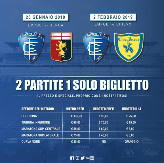 Bella iniziativa da parte della società per consentire ai tifosi di acquistare un bouquet di due biglietti a prezzi scontati ed assistere cosi alla doppia sfida interna contro Genoa e Chievo.