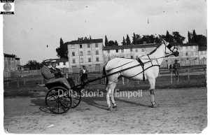 La piazza, come si vede dalla foto in copertina – risalente probabilmente ai primi anni del ‘900 – si presentava come un’area di diversi metri quadrati, a prato (dove si vedono panni ad asciugare), circondata da un anello ovale in terra battuta che si sviluppava in lunghezza tra la via che costeggia la piazza (la stessa via di oggi, sulla quale si affcciano negozi, bar e abitazioni private) e l’Arno. Quella era probabilmente la pista per le corse dei cavalli. L’ Ippica sarà uno sport seguito ad Empoli e lo fu ancora per diversi anni, almeno fino agli inizi degli anni ‘30’. Ne vediamo un esempio in questa bella foto della Collezione Pagli-Lari che abbiamo ripreso dal sito www.dellastoriadempoli.it