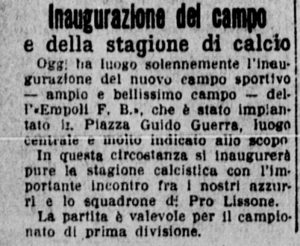 I problemi finanziari sembrano però risolti perché il 20 ottobre 1929 “ ha luogo solennememte l’inaugurazione del nuovo campo sportivo – ampio e bellissimo campo! – dell’Empoli F.B. che è stato impiantato in Piazza Guido Guerra, luogo centrale e molto indicato allo scopo”. (5) E l’inaugurazione coinide con la prima partita del Campionato di Prima Divisione dove l’Empoli è stato promosso: ospite la Pro Lissone, sarà uno 0 a 0.