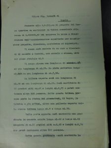 fornisce altre notizie: “…Misura una supercicie di mq. 30.000. E’ circondato da muro alto, sul piano stradale, ml.3 e vi si può accedere da due cancelli ai lati della costruenda tribuna coperta sul prolungamento di via Giacomo Puccini, da altri due cancelli ai lato della gradinata dal lato di levante, nonché da altro cancello dalla parte di tramontana. Il campo di giuoco ha una lunghezza di ml. 110 ed una larghezza di ml. 75. La pista podistica ha uno sviluppo di ml. 461 ed una larghezza di ml. 7,50….(omissis)…La tribuna coperta progettata lunga ml. 30 potrà contenere oltre 600 persone e la gradinata prevista di una lunghezza di ml. 40 potrà contenere oltre 800 persone. Ai lati e di fronte alla gradinata rimane un parterre che può contenere oltre 2.000 persone. Sotto la tribuna coperta e sotto la gradinata sono stato disposti tutti i locali necessari e indispensabili. I giocatori entreranno nel campo dal disotto della tibuna coperta in corrispondenza dei posti riservato alle autorità a mezzo di galleria in cemento armato”