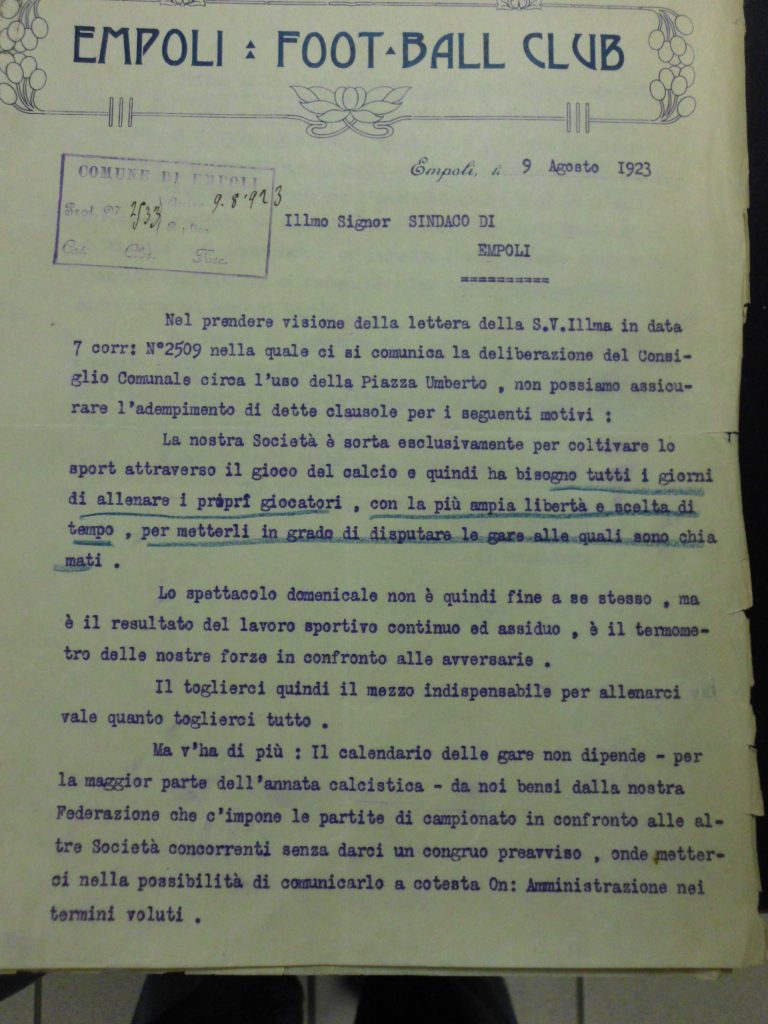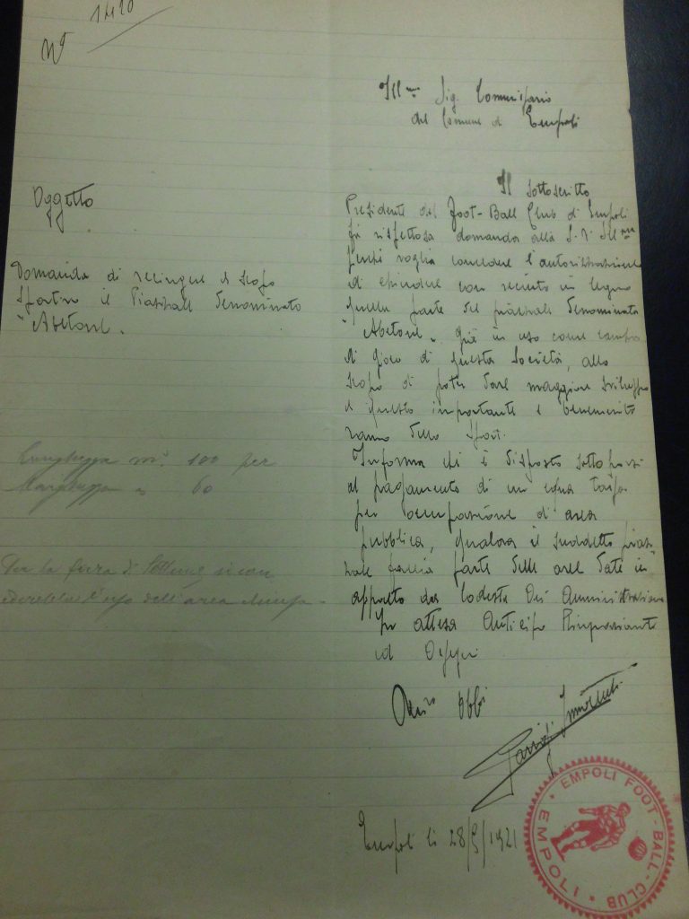 Nel corso della sua storia centenaria l’Empoli ha cambiato piΓΉ volte denominazione. Nel 1920, all’atto di fondazione della societΓ , troviamo la dicitura Empoli Foot-Ball Club. Un nome che, assieme all’acronimo EFBC, accompagnerΓ la neonata compagine empolese per circa un decennio. Lo troviamo sulla maggior parte dei documenti dell’epoca, ad esempio in questi reperti storici, tratti dall’Archivio Storico Comunale di Empoli. Nella foto [1] il presidente Parigi Innocenti chiede il permesso al Commissario Regio del Comune di Empoli di recintare il campo dellβAbetone (28-05-1921): a comprovare l’utilizzo del nome Empoli FBC non c’Γ¨ solo il riferimento al testo, ma anche il timbro ufficiale della societΓ .
