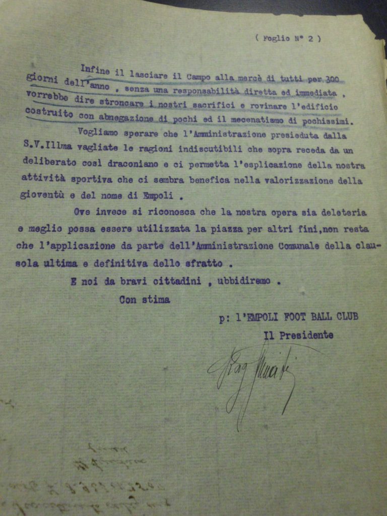 Le foto [2] e [3] testimoniano uno scambio di schermaglie tra il Comune e l’Empoli FBC circa l’utilizzo del campo dell’Abetone. Da notare innanzitutto come la lettera, redatta in carta intestata, rechi ancora una volta il nome Empoli FBC. Sostanzialmente Γ¨ la risposta a una delibera comunale che prevedeva che il campo sportivo non dovesse essere di uso esclusivo della squadra di calcio. L’Empoli prova a far valere le sue ragioni in tal senso, affermando il diritto a potersi allenare liberamente all’Abetone. Si afferma che “lasciare il campo alla mercΓ© di tutti per 300 giorni all’anno, senza una responsabilitΓ diretta e immediata, vorrebbe dire stroncare i nostri sacrifici e rovinare l’edificio costruito con l’abnegazione di pochi e il mecenatismo di pochissimi”.
