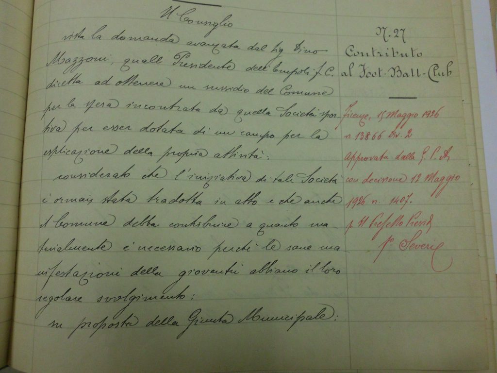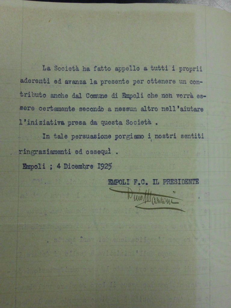 Una piccola ma sostanziale differenza di denominazione compare per la prima volta, nelle carte ufficiali, nel 1925. La societΓ Γ¨ intenzionata a costruire un nuovo impianto di gioco e chiede al Comune di contribuire economicamente. Nella foto [4] si nota come in basso, sopra alla firma del presidente Dino Mazzoni, compaia la scritta “Empoli F.C.”. E anche la risposta dell’amministrazione cittadina [5] in cui viene accordata l’elargizione, utilizza la stessa dicitura. La sensazione Γ¨ che perΓ² sia piΓΉ una questione di forma che di sostanza.