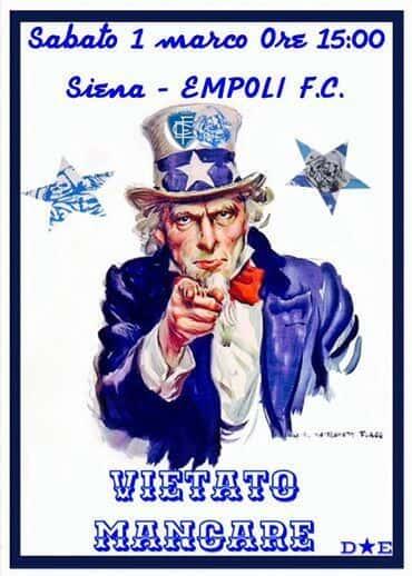 ma siete pochini, noi siamo andati in 1200 a firenze d giovedì sera per la partita di coppa italia, e a empoli di martedì s’era parecchi pur essendo di martedì sera. Ora d sabato che un ce la fate a esse almeno in 500 ? Empoli da siena dista 80 km a dilla grassa, gnamo su, a parte i desperados che ci so sempre, l’altri che so tifosi da bar o da circolo arci ?